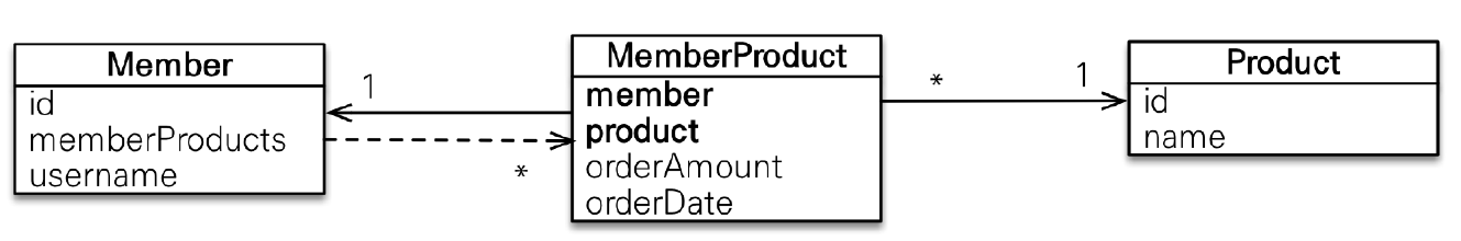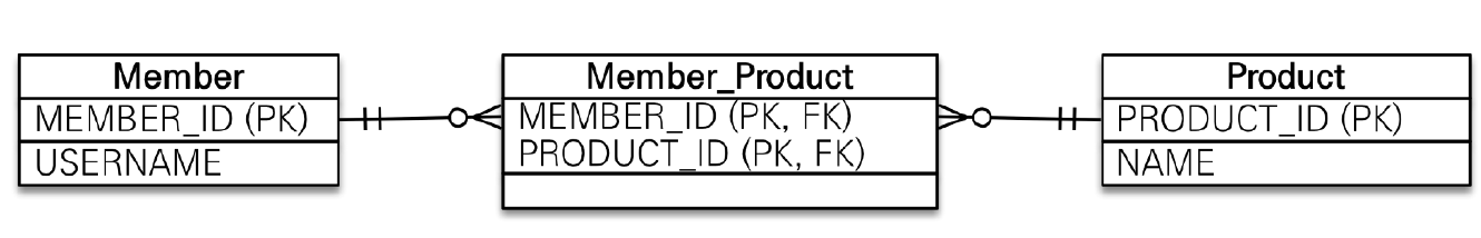 코드 예시에서는 중간 테이블로 MemberProduct 테이블을 만들었고 @OneToMany 및 @ManyToOne 관계로 풀어냈다.