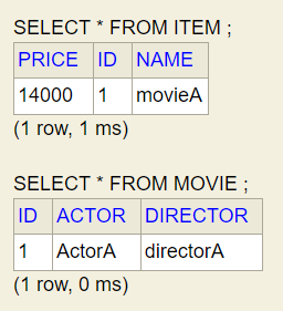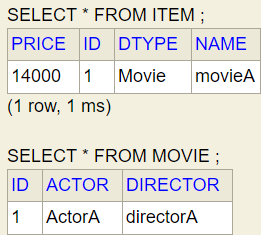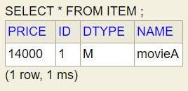 ITEM 테이블에 DTYPE 컬럼이 추가됐고 Movie 엔티티 타입 정보를 저장한 것을 확인할 수 있다.