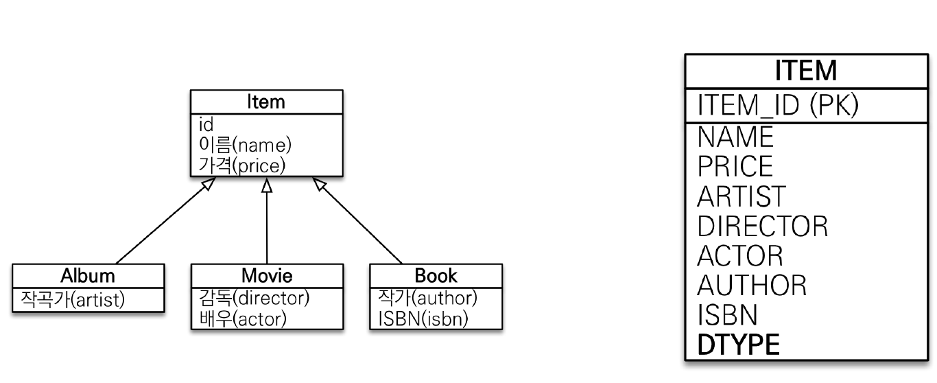 - 한 테이블에 컬럼을 다 때려박고 DTYPE으로 자식 엔티티를 구분하는 전략이다.
