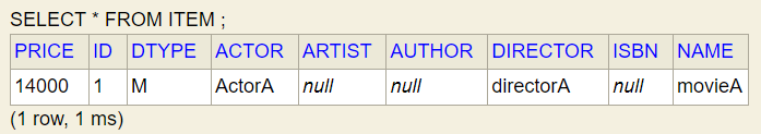 (PRICE, DTYPE, ACTOR, DIRECTOR, NAME에 값이 있는 것은 애플리케이션 실행부에서 Movie에 대한 정보를 넣어줬기 때문이다.)