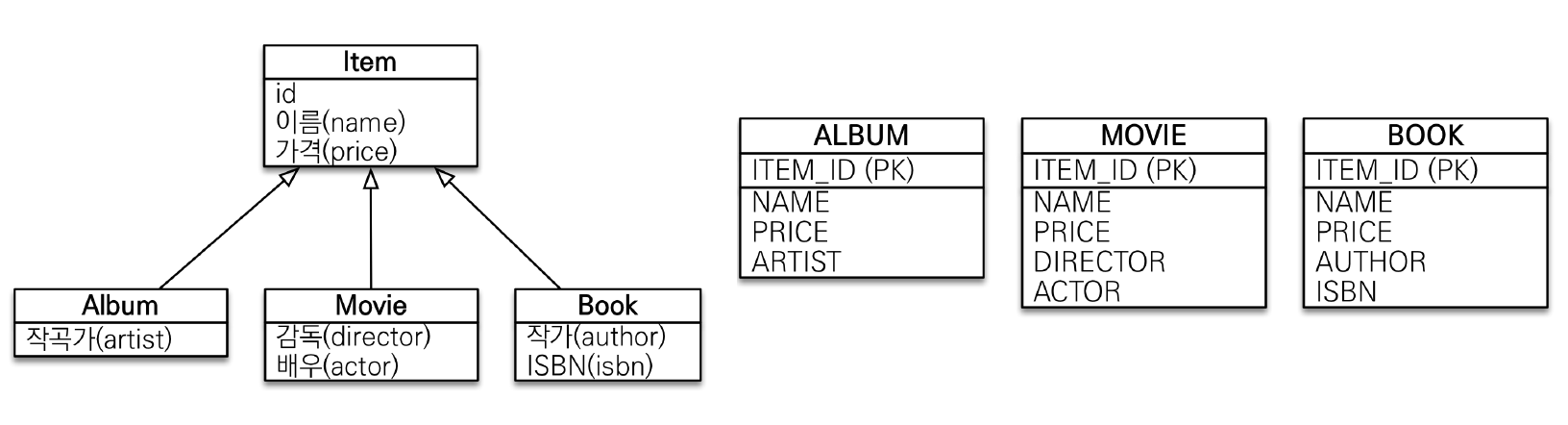 - 상위테이블(슈퍼타입)없이 상위 테이블이 가질 NAME, PRICE와 같은 속성을 하위 테이블(서브타입)이 갖는다.