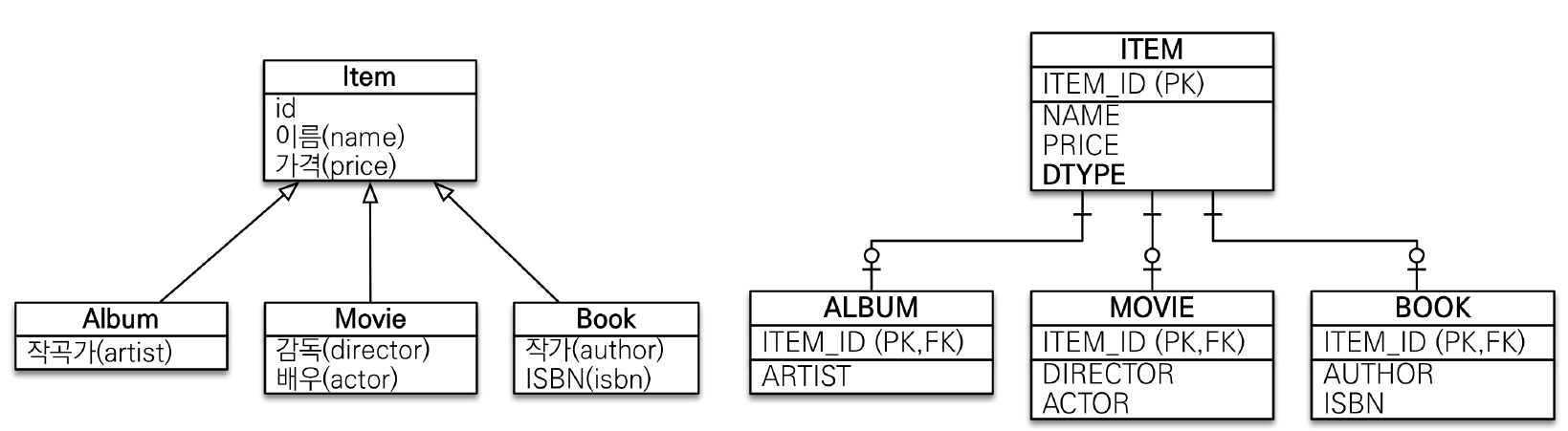 | 조인 전략 | - 부모와 자식 클래스에 대해 별도의 테이블 생성 - 조인 사용 |