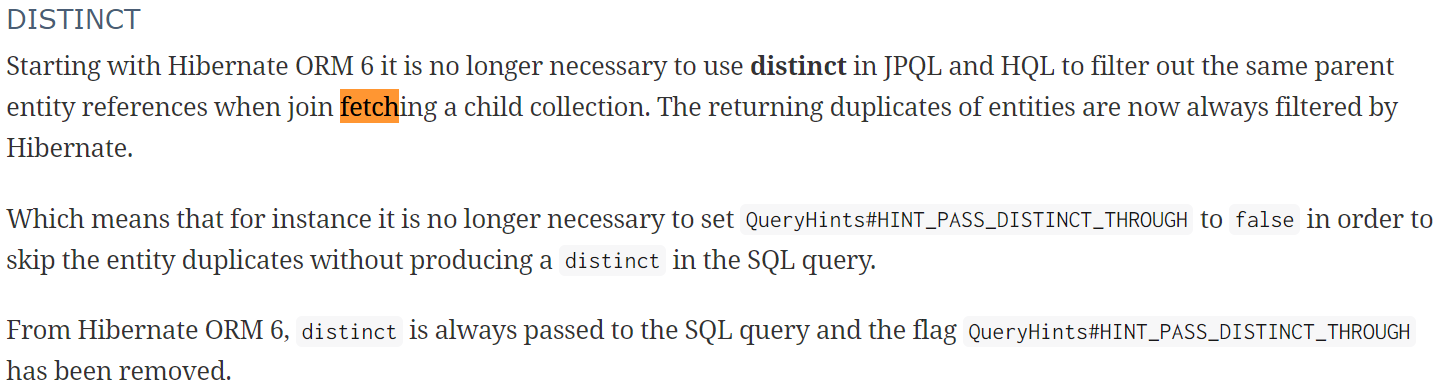 - Hibernate 6 버전부터는 JPQL에 distinct를 사용하지 않아도 반환되는 엔티티 중복을 항상 필터링한다.