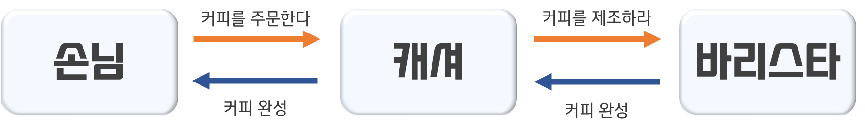 손님은 커피를 주문하고 캐셔는 주문을 바리스타에게 전달하고 바리스타는 커피를 만든다.