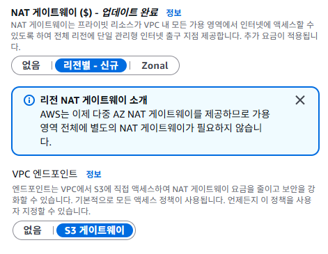 'S3 게이트웨이'를 선택하면 S3로 가는 데이터는 NAT를 안거치고 무료로 데이터를 처리할 수 있다.