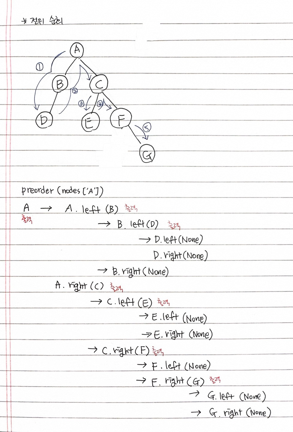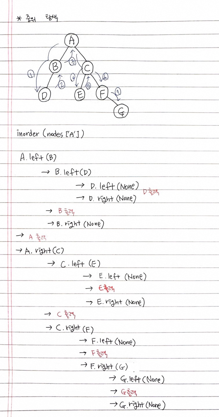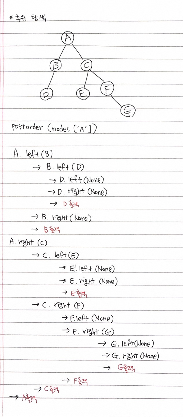 - F의 왼쪽 자식인 G를 방문 (A → B → D → C → E → F → G) G 출력
